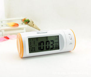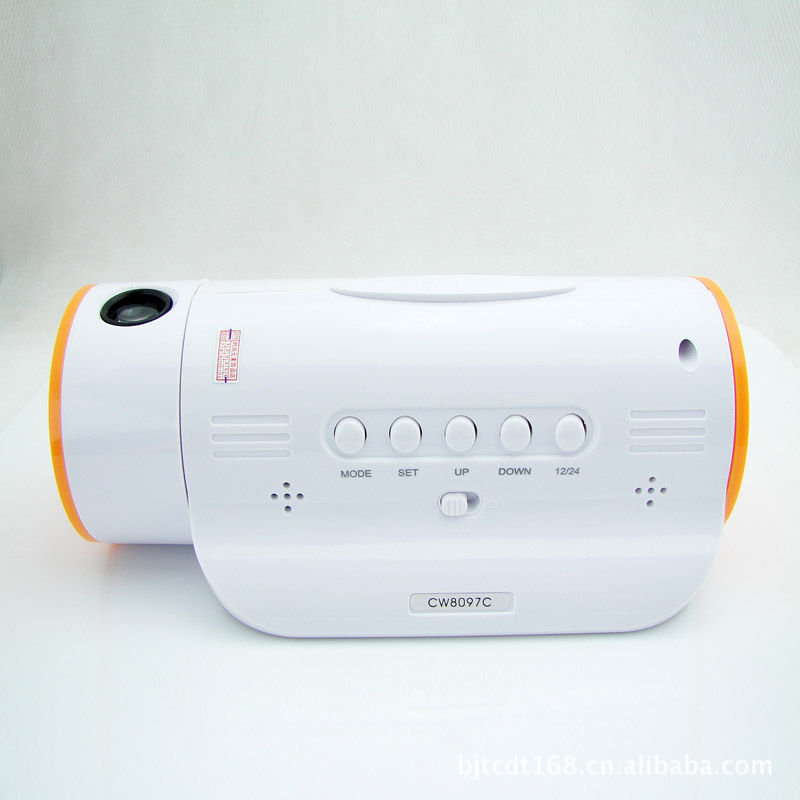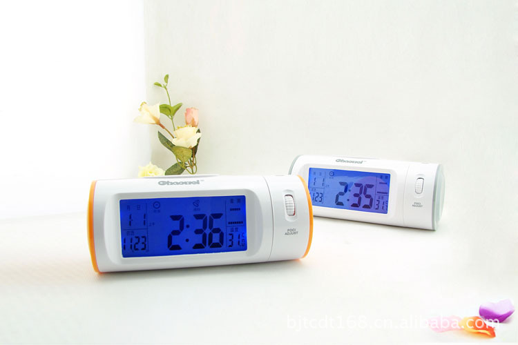 1: 在產品附近輕輕拍一下手掌,或輕敲擺放產品的臺面,或輕觸產品任何部位,背光燈立即點亮,同時投影燈也點亮,可將時間投影在墻壁或其它物體上;