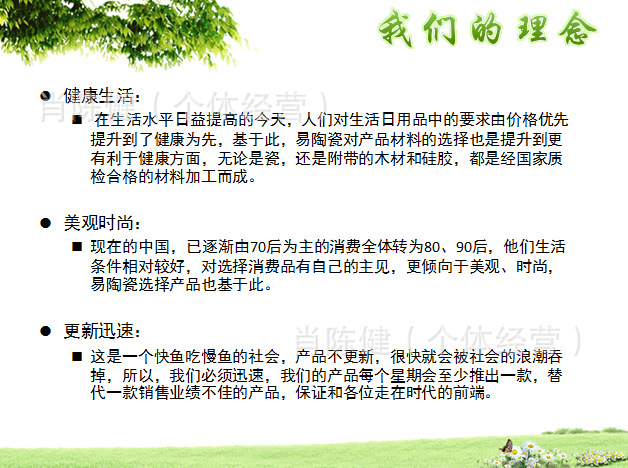易陶瓷2011年開始,產品價格大幅下降,破損率比較低,所以再次強調破損不保,不退,謝謝理解。