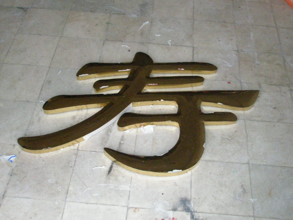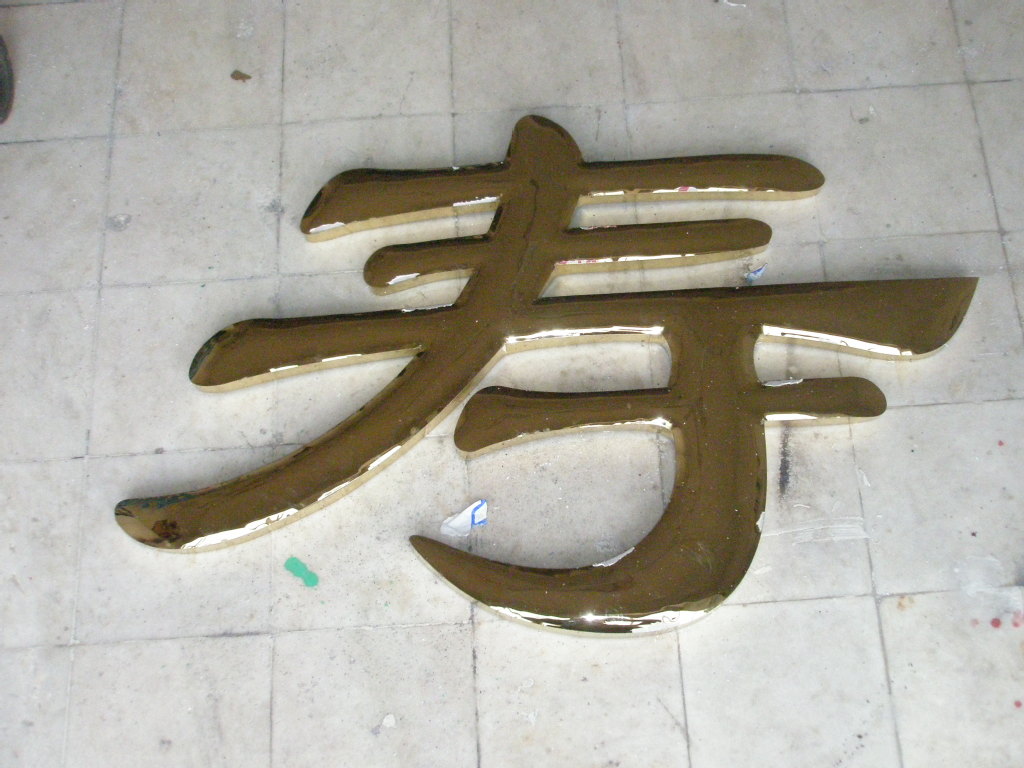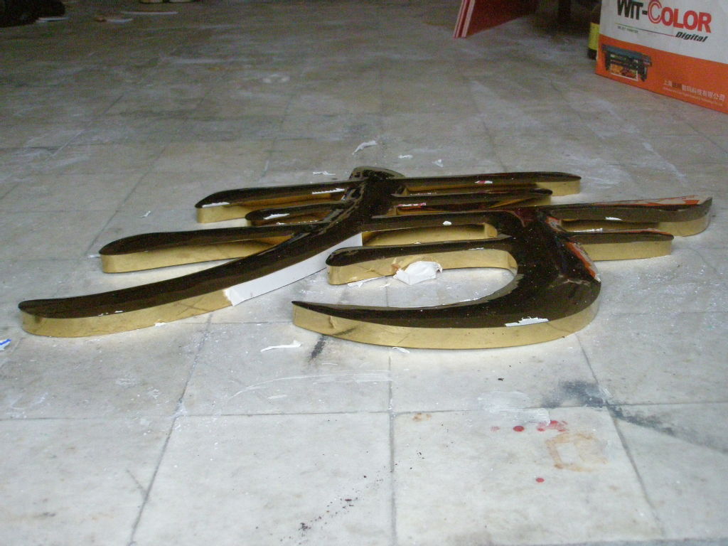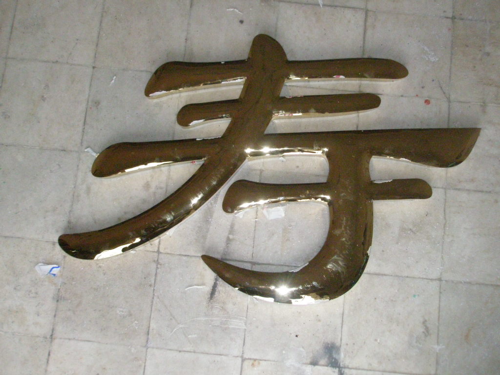 九)鈦金字噴膜:噴膜之前,一定要仔細檢查字表面的光潔度,特別是施工鍍過的字,需要再用布輕拭字面,沒有痕紋或水漬的方可噴膜,用噴槍噴涂,用硝酸纖維漆(無色透明)或過氯乙烯均可。不易過厚。噴好后不要碰,用軟紙包裝,運赴使用現場安裝。