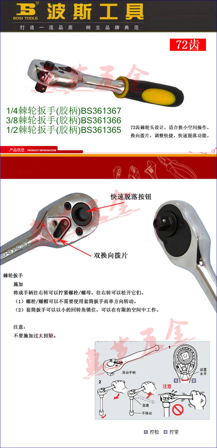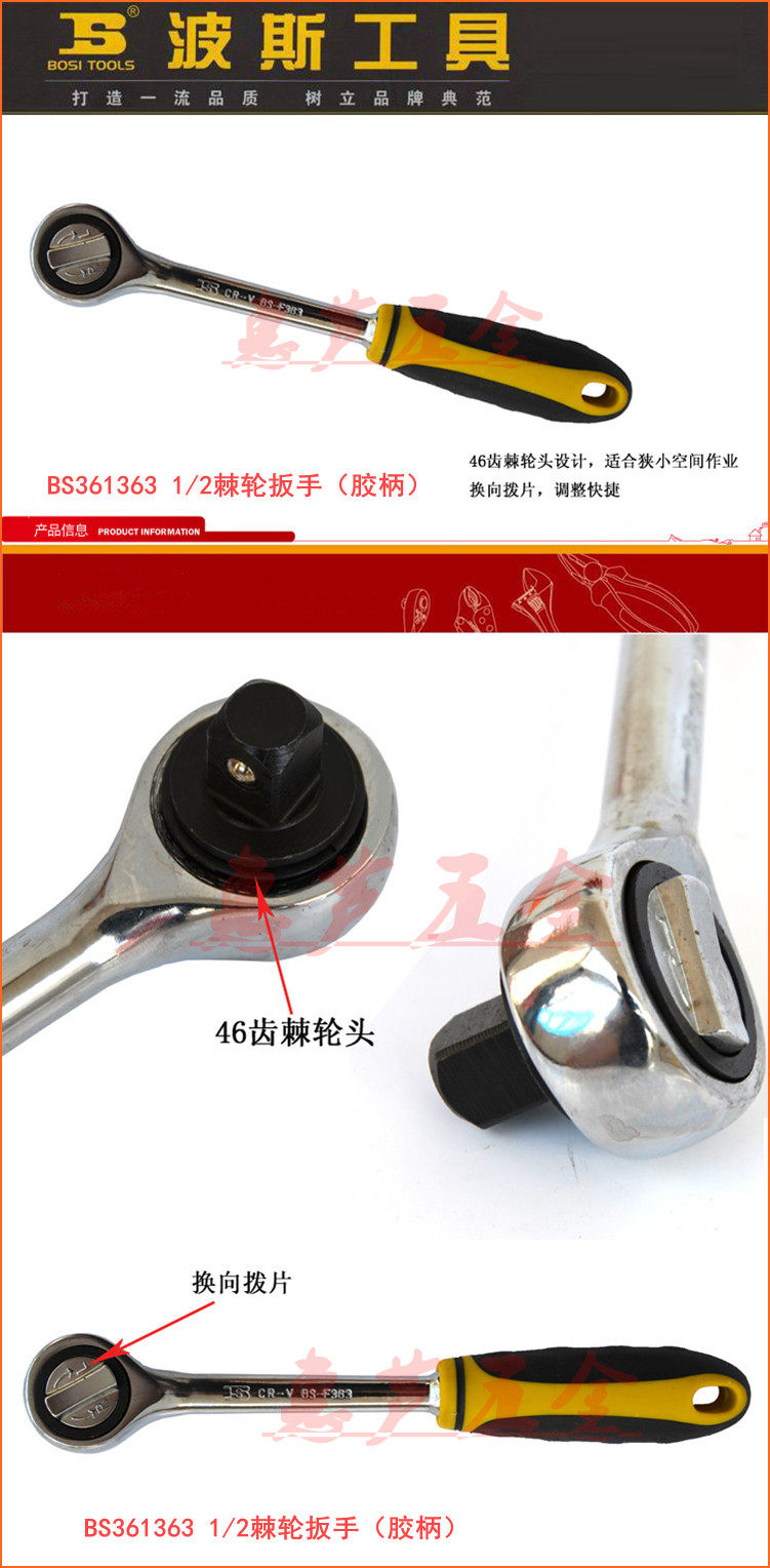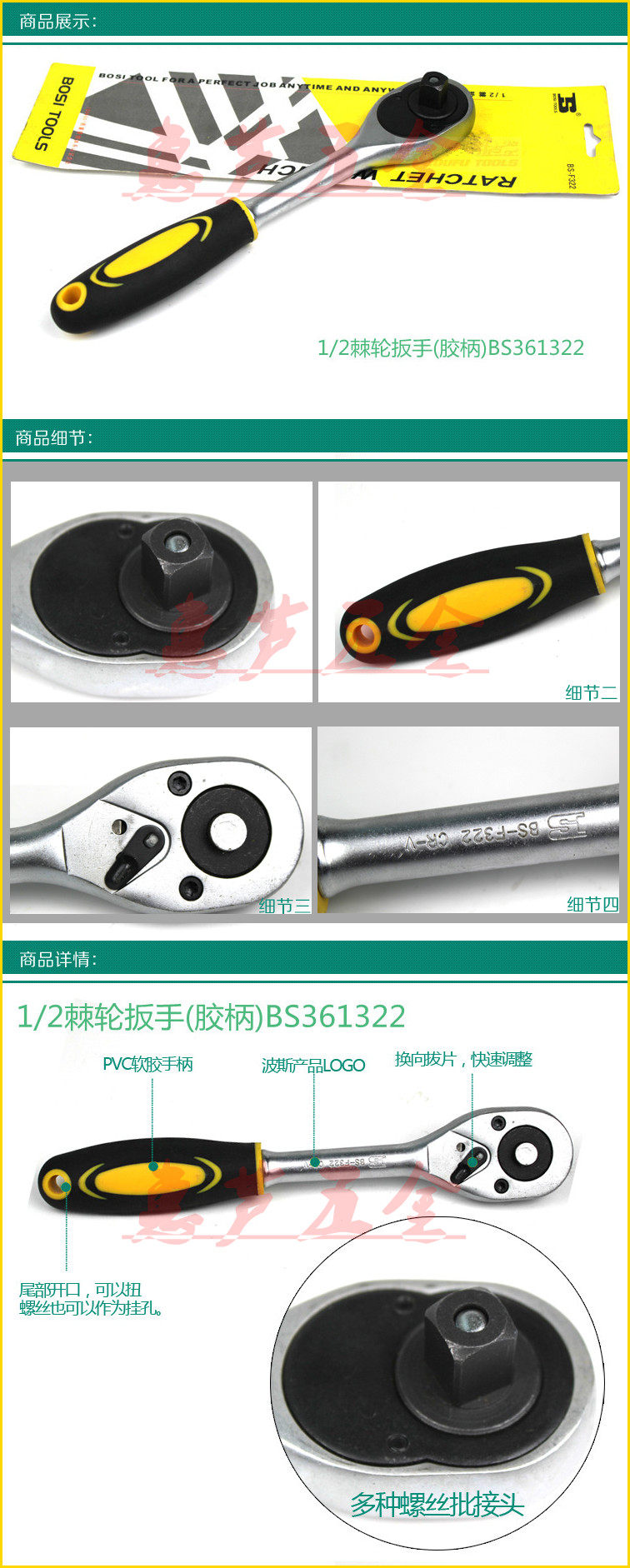 BS361365/1/2棘輪扳手(膠柄)72齒,BS361366/3/8棘輪扳手(膠柄)72齒,BS361367/1/4棘輪扳手(膠柄)72齒,BS361322/1/2棘輪扳手(膠柄)24齒,BS361363/1/2棘輪扳手(膠柄)46齒,BS361325/1/2棘輪扳手(鋼柄)46齒