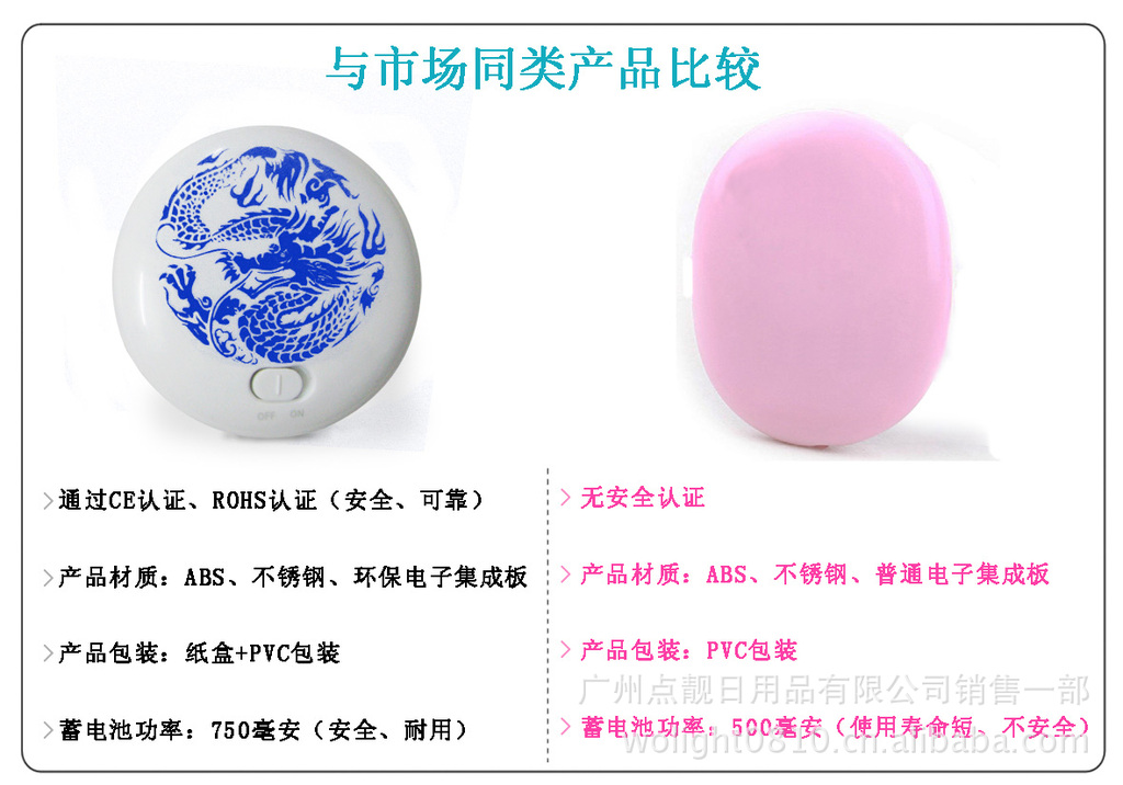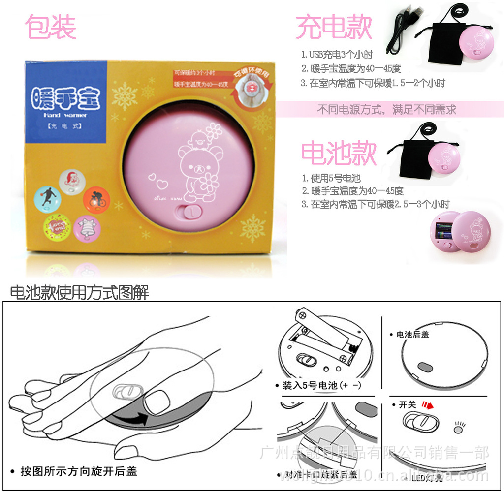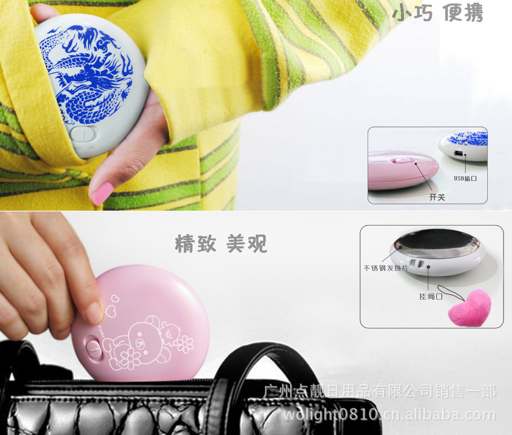 1.體積小巧、美觀,攜帶方便,圓形設計,人性化雙面翻轉手握暖手