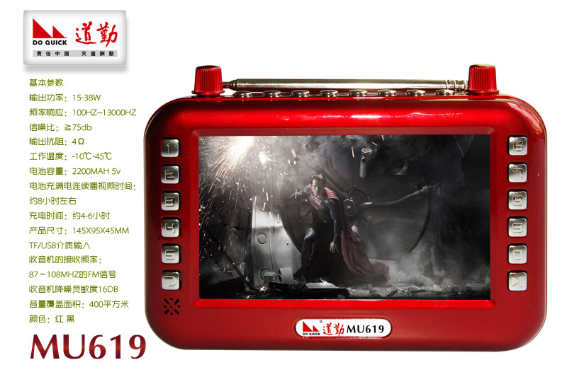 6、帶4.3寸TFT液晶高清彩屏顯示,TF/USB和FM,MP3 MP4,MP5音樂,視頻文件播放,收音機/相片、電子書閱覽等播放功能,良好的聽覺效果.