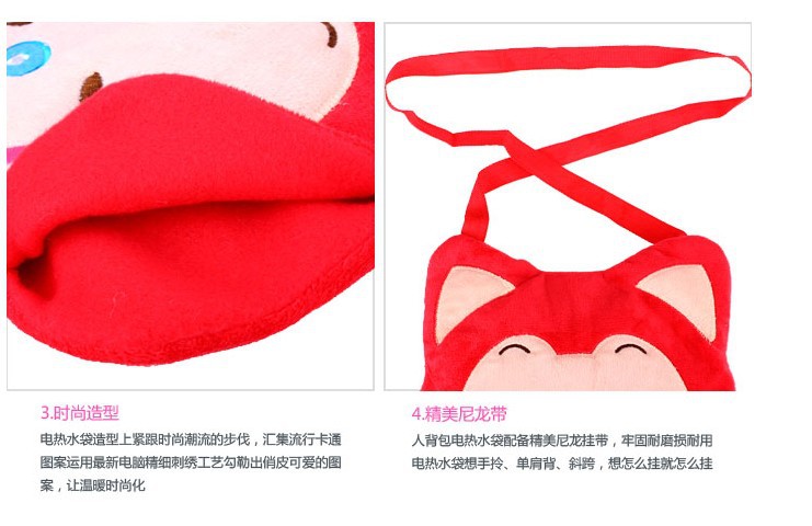 愛 藝背包電熱水袋,超萌可愛小玩偶,為電熱水袋穿上美麗的衣裳,超柔毛絨,質地細膩,手感柔軟。獨創雙插手設計,手心手背均勻受熱,溫暖呵護雙手。采用高新 科技打造,認證自動溫控加新一代防爆技術,使用安全可靠。以高儲能制熱液為發熱體,通過袋內半導體均勻加熱儲能,升溫快、保溫更持久。有效減少凍瘡、關節 炎、慢性胃腸病的發生,有效緩解痛經,具有消除肌肉疲勞和舒展血脈等保[jian]功能,是冬季理想的保暖、熱敷理療輔助佳品。