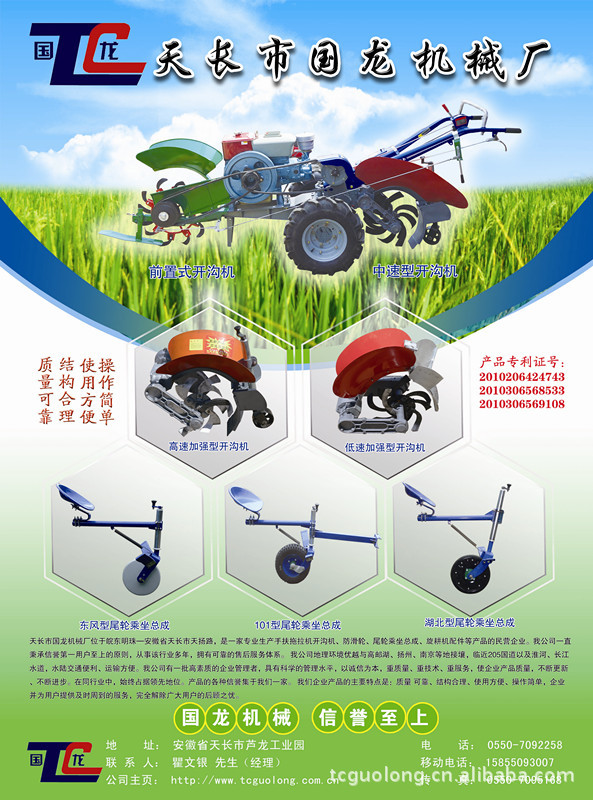 本公司主要經營微耕機鋼圈及輪胎400-8鋼圈,全柴180型尾輪總成,東風-12型尾輪總成,工農型乘坐總成,武漢型乘坐總成,尾輪叉,腳踏板,防滑輪,1米1.2米蓋耔機,橡膠尾輪,工農鑄鐵尾輪,湖北型運輸尾輪,鋼尾輪,101,121,東風-12型前置式開溝機,121,東風-12型后置式開溝機等。本公司秉承“顧客至上,銳意進取”的經營理念,堅持“客戶”i安徽省天長市國龍機械廠生產的1GL-12型前置式開溝機,適用于三麥、油菜等農田開溝作業。