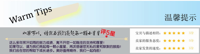 4,退貨問題:不好意思買家,本廠暫不接受無條件退貨。若產品質量問題需要退貨的情況,退貨前請先聯系客服做好登記,并麻煩您盡可能提供多點的產品信息圖片,以便我們后續工作的進行。