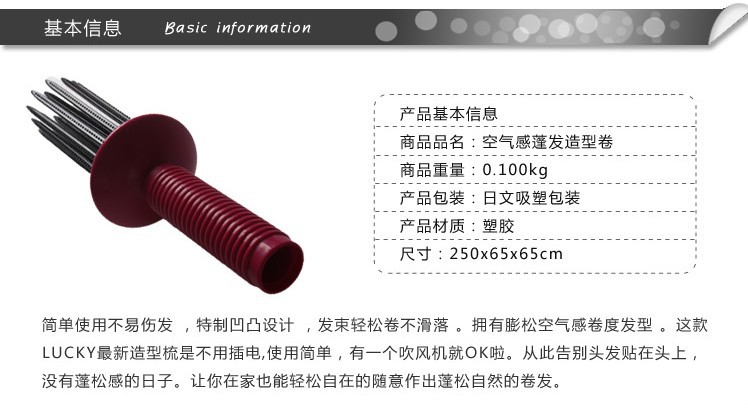 [商品單位]把[單個重量]0.100千克[商品材質]塑膠[商品包裝]日文吸塑包裝[商品產地]中國[裝箱數量]100[外箱規格]60.5*43*52.5★單手輕鬆將髮束捲起~需搭配吹風機一起使用喔!