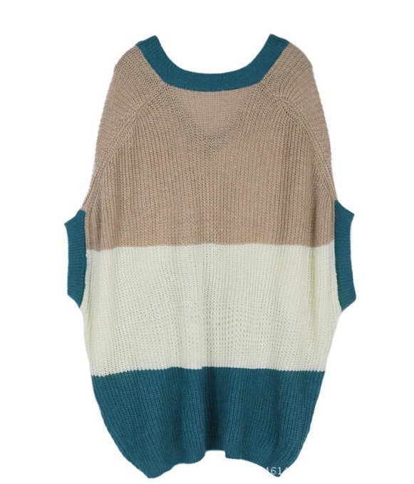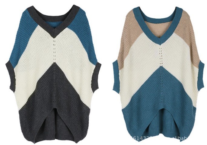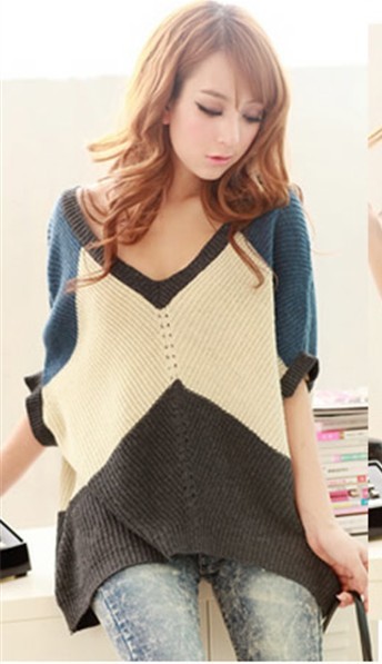 中袖拼色V領毛衣。