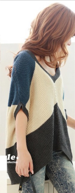 時尚中袖蝙蝠袖針織V領寬松毛衣!