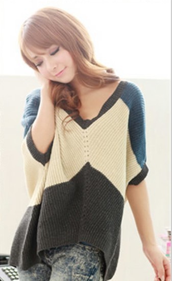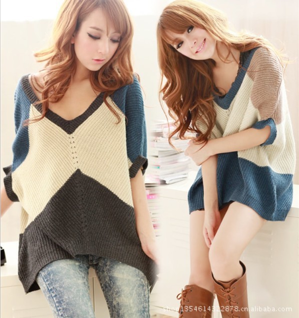 2012秋冬裝新款韓版女裝 時尚中袖蝙蝠袖針織V領寬松毛衣