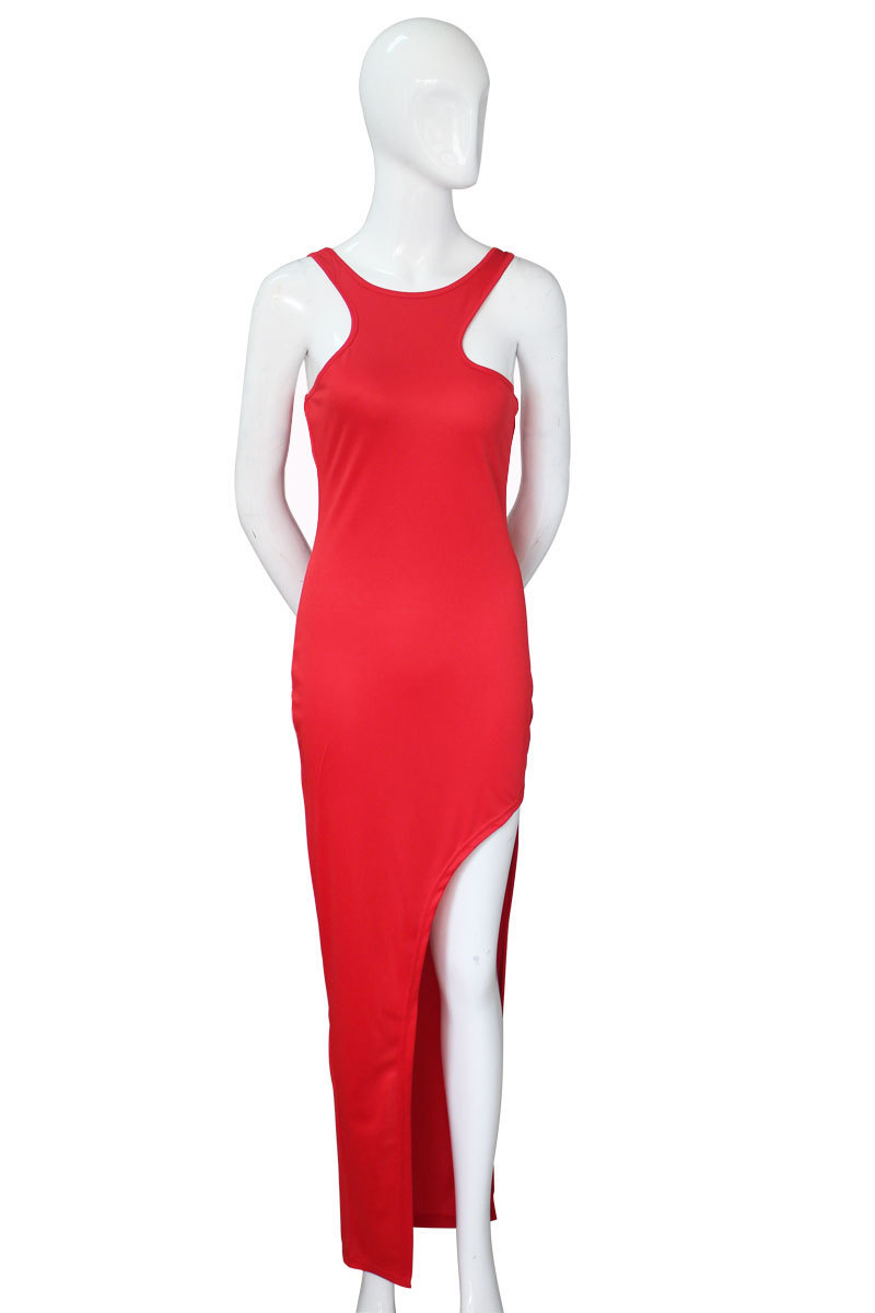 歐美新款性感修身不對稱背心長裙 下擺開叉連衣裙Party禮服長裙