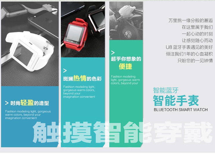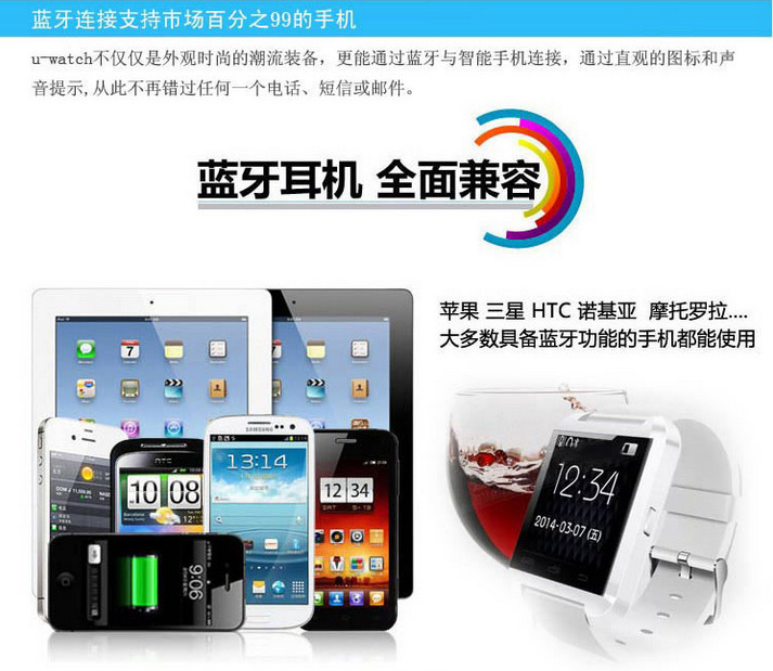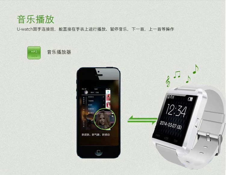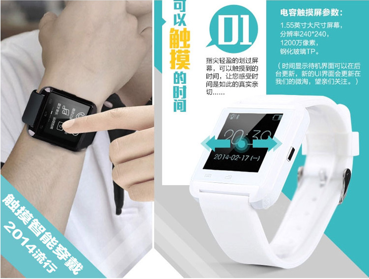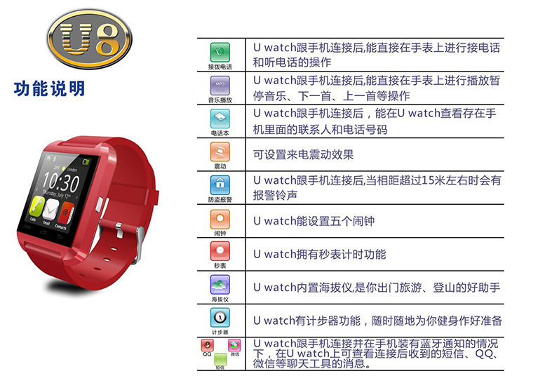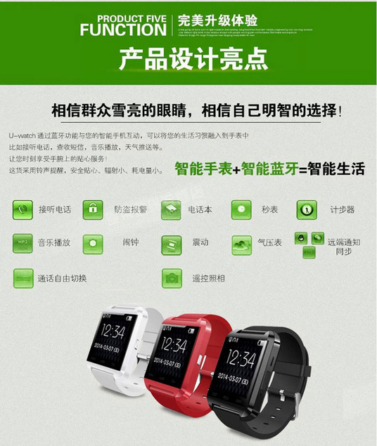 功能簡介:支持觸屏操作、有撥號盤可隨意按號撥打、同步手機電話本、同步手機mp3音樂播放、來電顯示、來電震動或鈴音提醒、計步器、氣壓計、高度計、秒表、鬧鐘、防盜報警,安卓的手機大部份可同步手機短信、QQ 微信等信息提示或查看、可遙控手機拍照。