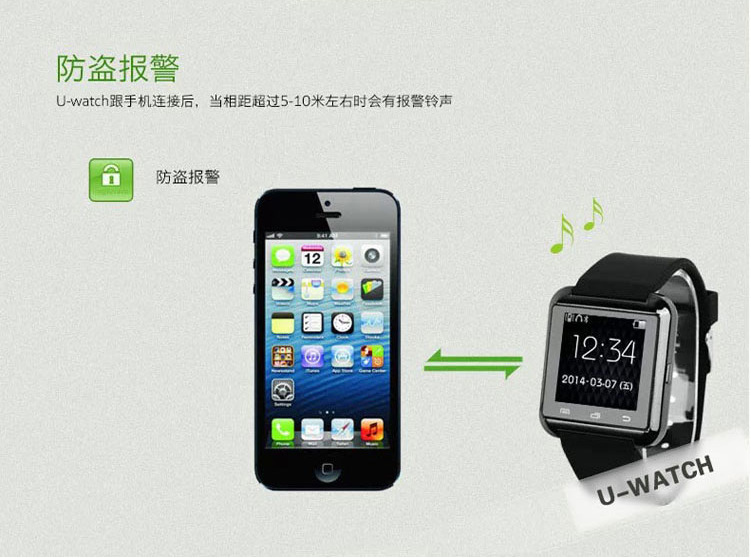 5.防丟失功能當智能手機掉了,超過10米左右,手表就會響鈴或者震動提醒你,從此不再擔心遺失手機;