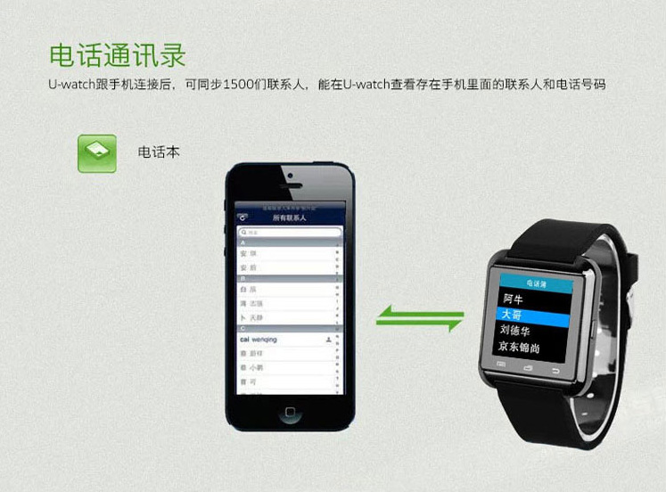 3.同步智能機上的電話薄不用掏智能手機就可以在手表查詢或者撥打電話;