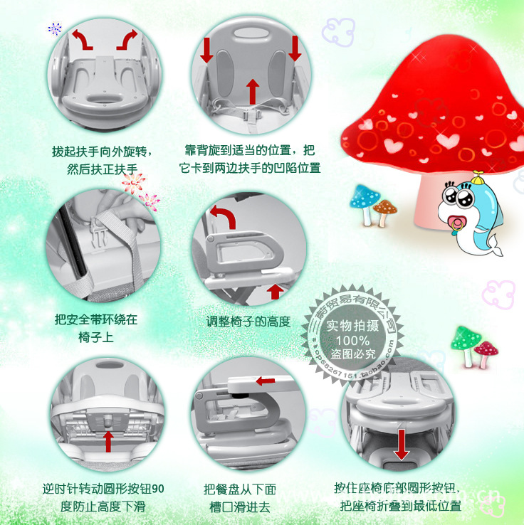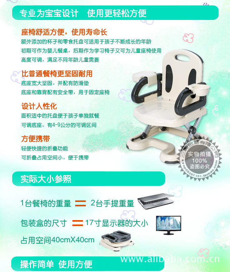 6.高度調整范圍:4-9CM;伴隨嬰兒成長,多年使用,初期可作為嬰兒餐桌,后期作為學習椅子設計靈巧,可折疊,方便攜帶