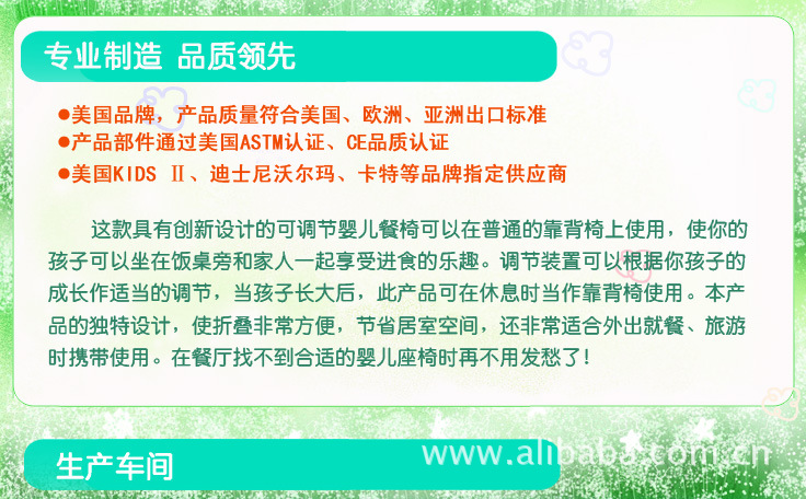 5.可作為BB凳;可作為獨立的嬰兒餐桌;可作為幼兒學習椅,有固定裝置(松緊扣),如固定在木椅上,讓寶寶和大人“齊平”進餐;有固定嬰兒的安全帶