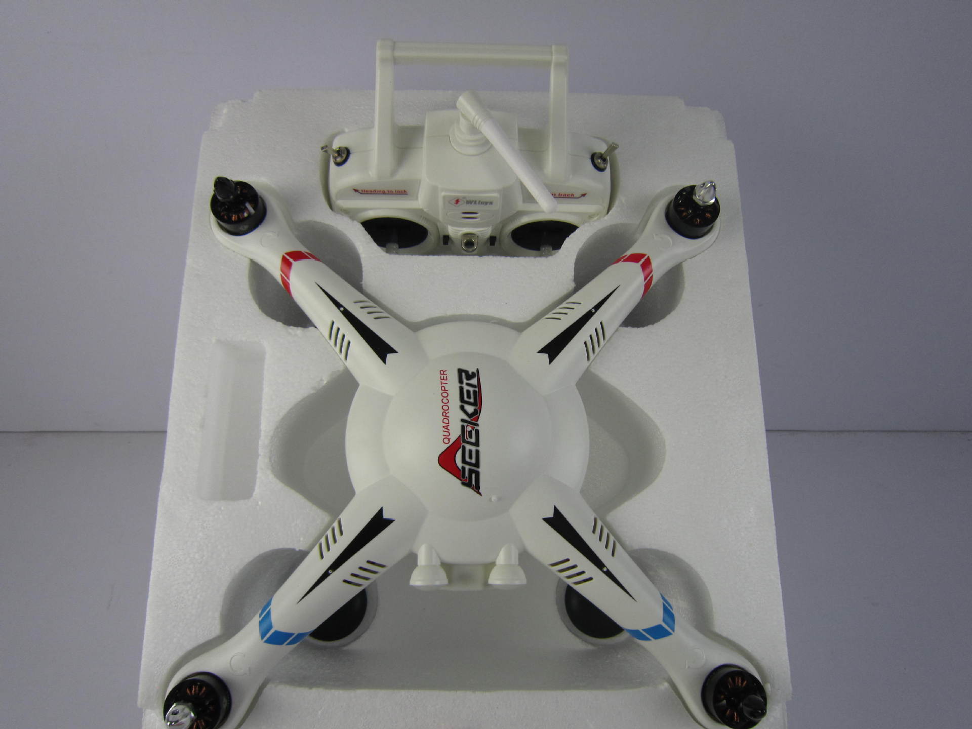產品附帶配件明細: 彩盒包裝*1、飛行器*1、遙控器*1、說明書*1、充電器*1、風葉*4、鋰電池*1 數據線*1 六角扳手*1 GOPRO云臺架*1
