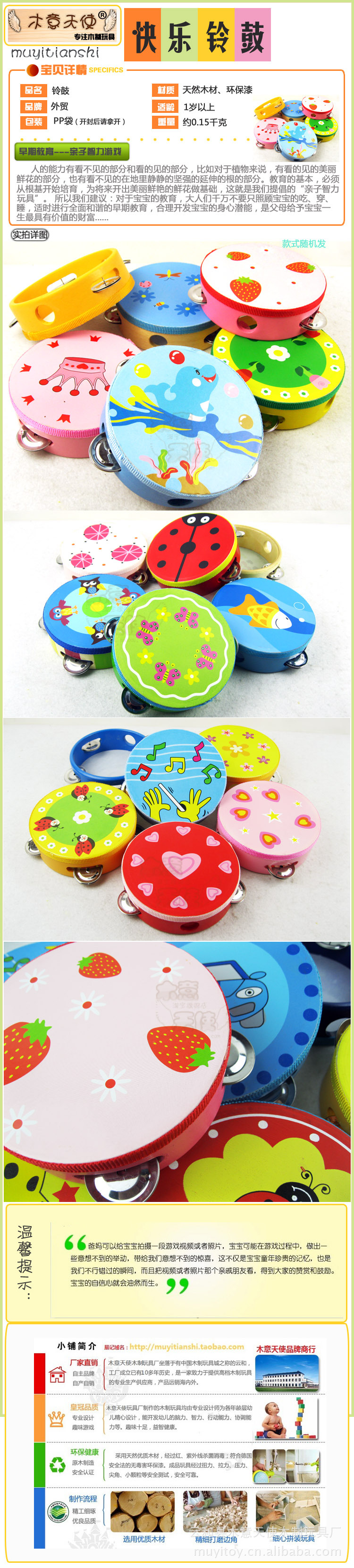 產品介紹:本款產品采用天然荷木環保漆精心制作而成,鼓面上絲印上可愛的動物圖案,圓形的手柄上有四個鈴;寶寶們喜歡有聲音的物體,敲擊對寶寶肢體運動感覺很有幫助,同時也可以訓練手眼協調能力??蓯蹌e致的動物手搖鈴鼓樂聲清脆,音色飽滿;讓孩子在敲擊的過程中開發孩子潛在的藝術細胞,增添樂感,從而達到學習音樂常識的目的.