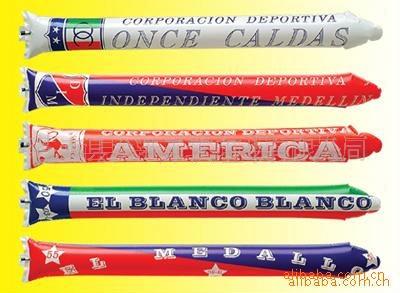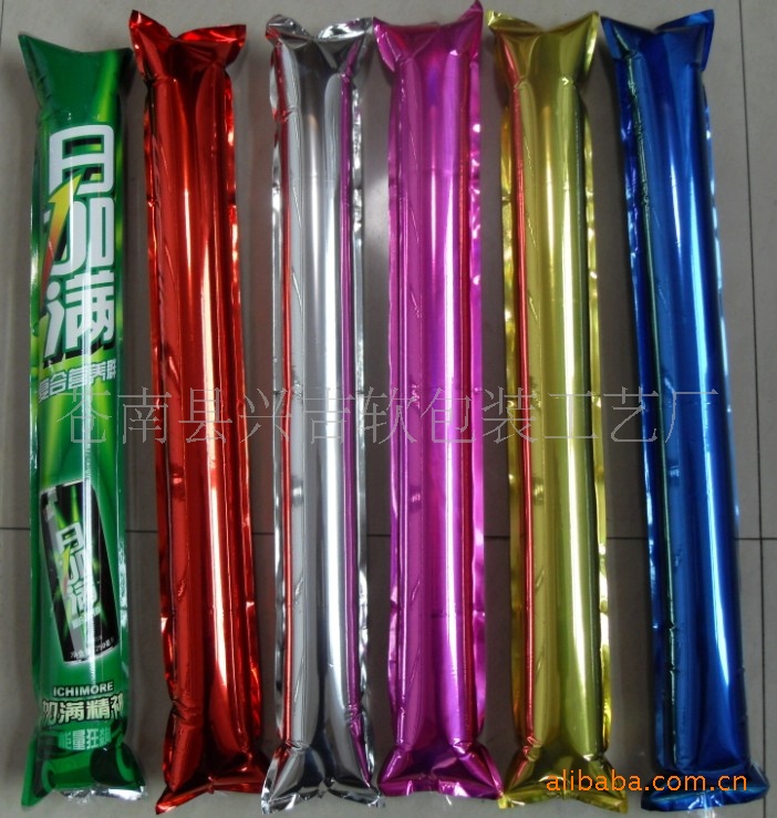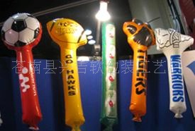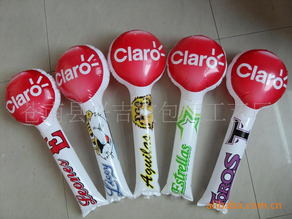 充氣棒用新引進高強度進口PE料制成,拉伸強度為130,耐磨不漏氣,兩棒敲擊可發出金屬音響,制造熱烈氣氛,鼓舞士氣,正反面可印全彩圖案或圖片,8色全自動電腦印刷機,印刷技術高超,色彩鮮艷,更能提高廣告效果.,充氣后自動封口。