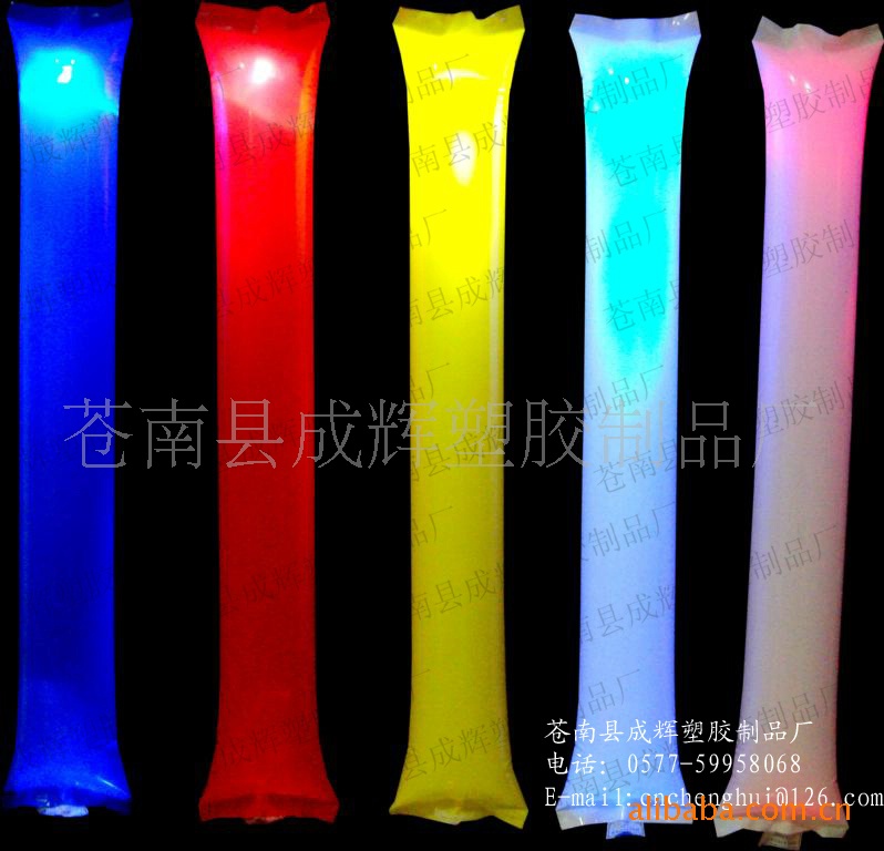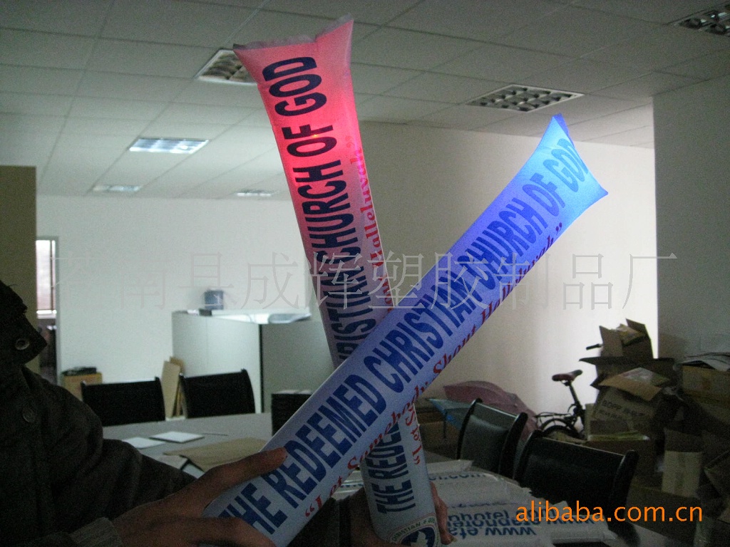 塑料充氣棒由HDPE(高壓膜)材料制成,充氣后互相碰撞能發出金屬的聲音,制造熱烈氣氛,鼓舞士氣,還可制作成平頭,圓頭,尖頭帶燈,帶須,等各種形狀,吹氣口充氣后自動封口。