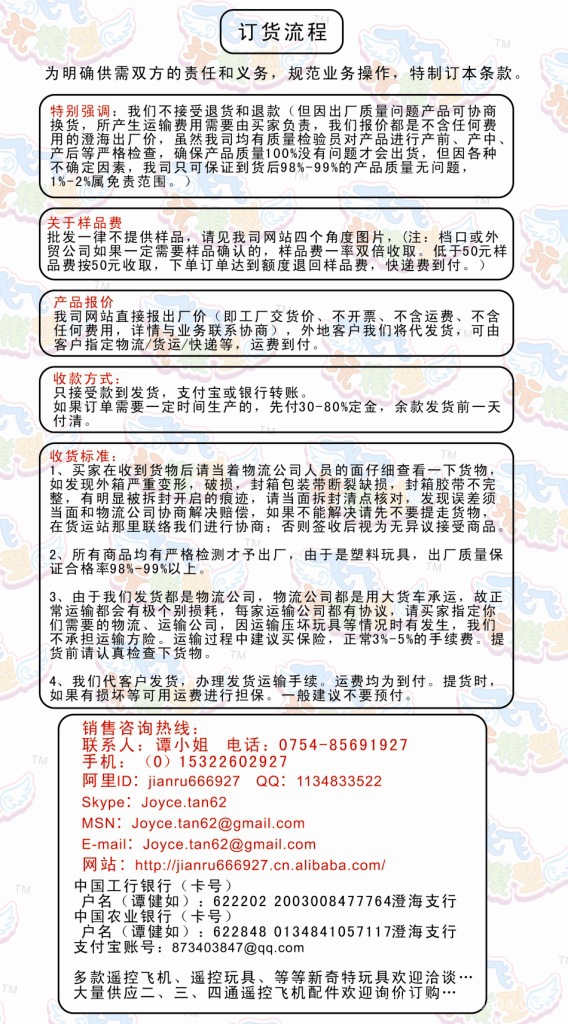 飛飛玩模型位于汕頭市澄海區,地理位置優越,交通便利。主要銷售各種遙控玩具和電動玩具以及其它功能的塑膠玩具、工藝品、電子配件等。擁有一批專業的內銷和外貿的專業營銷人才,以“客戶的需要”為工作導向及時高效的滿足客戶需求??蛻舯椴既蚨鄠€國家和地區,形成強大的營銷網絡、良好的服務體系和穩固的經貿關系。