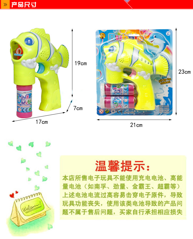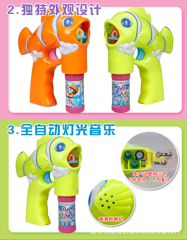 3--泡泡槍使用過程中請不要傾斜或倒置,因為泡泡槍噴口處帶有一個余水回收裝置,如果傾斜幅度過大或倒置,泡泡水會流出來的。全自動的泡泡槍都是這樣的,請買家不要誤會是質量有問題。