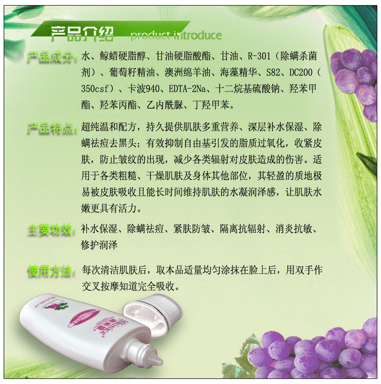 產品特點:超純溫和配方、持久提供肌膚多重營養、深層補水保濕、除螨祛痘去黑頭;有效抑制自由基引發的脂質過氧化,收緊肌膚,防止皺紋的出現,減少各類輻射對皮膚造成的傷害。適用于各類粗糙、干燥肌膚和身體其他部位,其輕盈的質地極易被肌膚吸收、長時間保持肌膚的水凝潤澤感,讓肌膚水嫩更具活力。