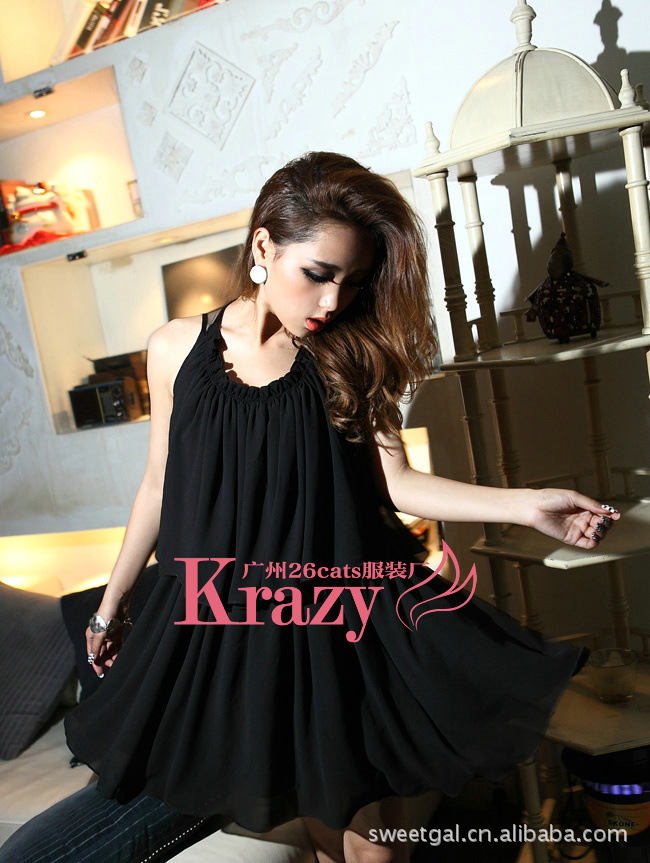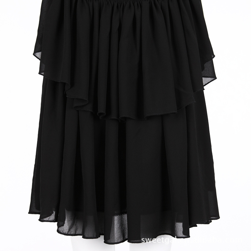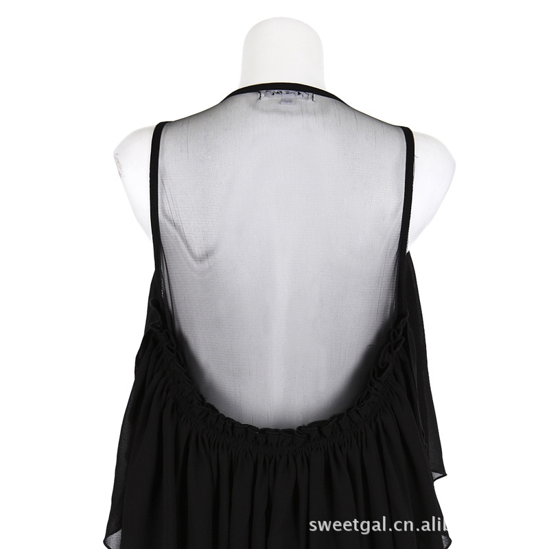 【時尚元素】層疊的大衣擺,柔軟輕盈的雪紡裙嫵媚而嬌貴!小高腰薄紗大裸背設計,呈現女人完美線條,浪漫而性感。利落的黑色,一款精致的雪紡裙,又能讓嬌柔盡現。