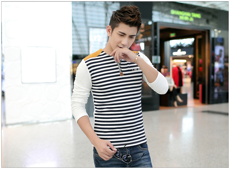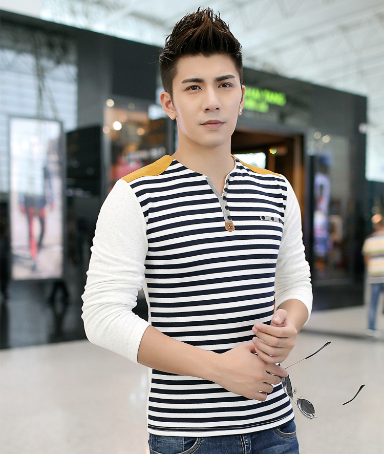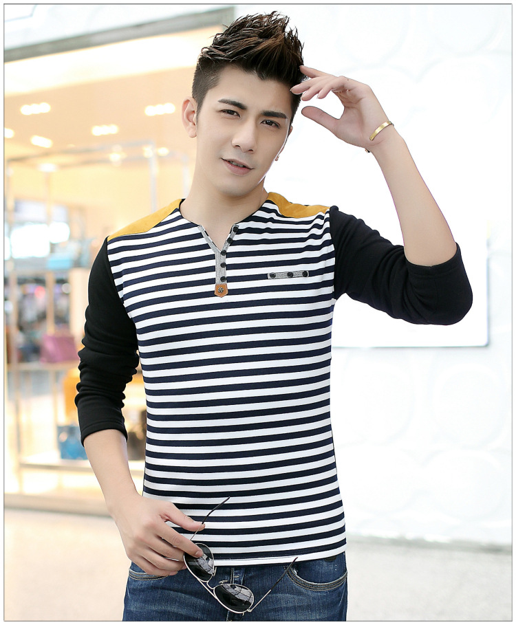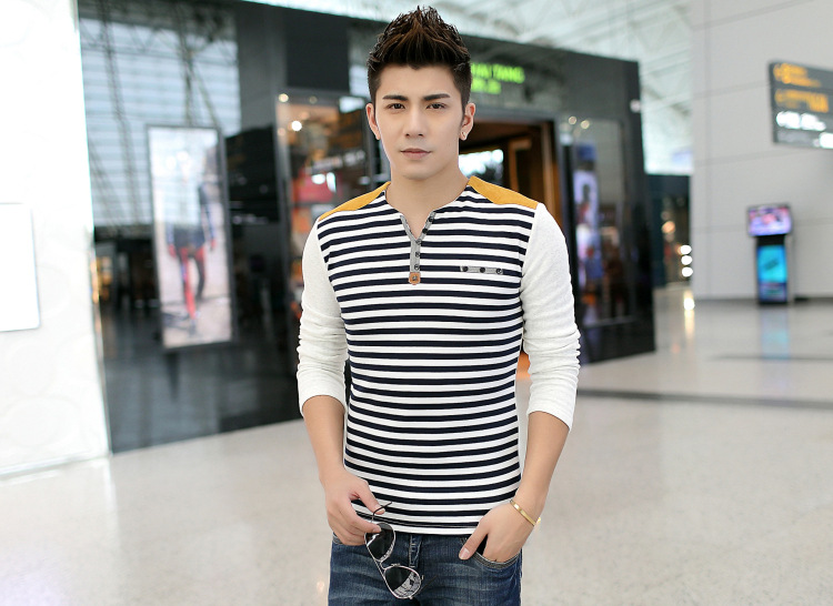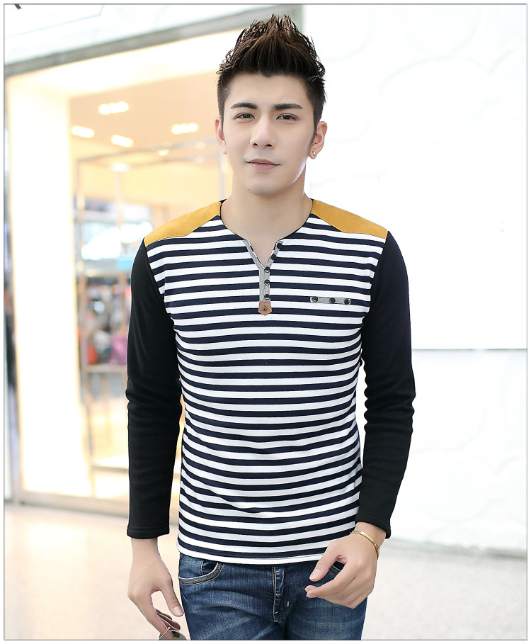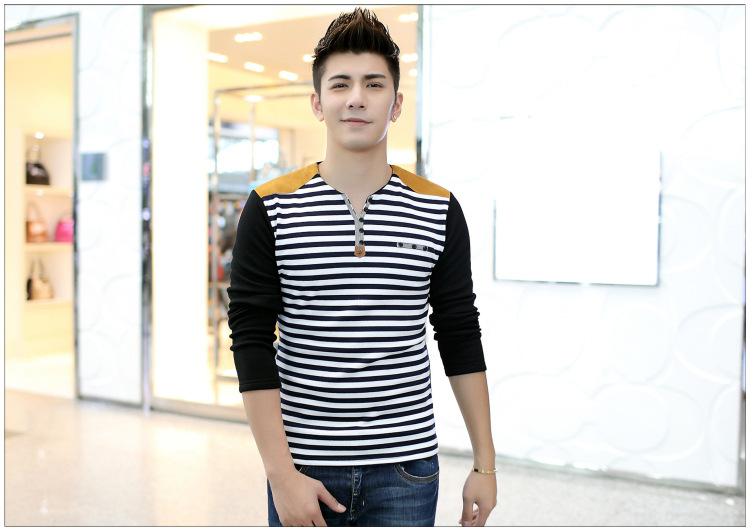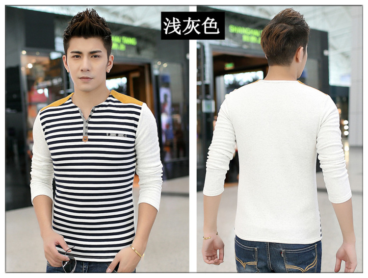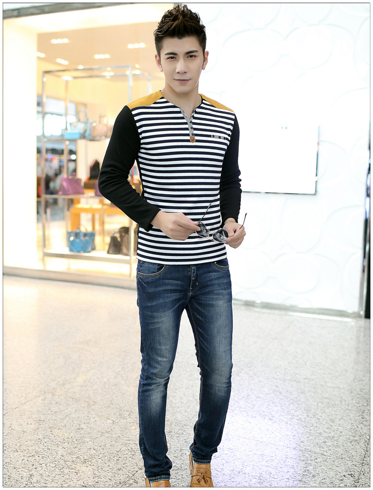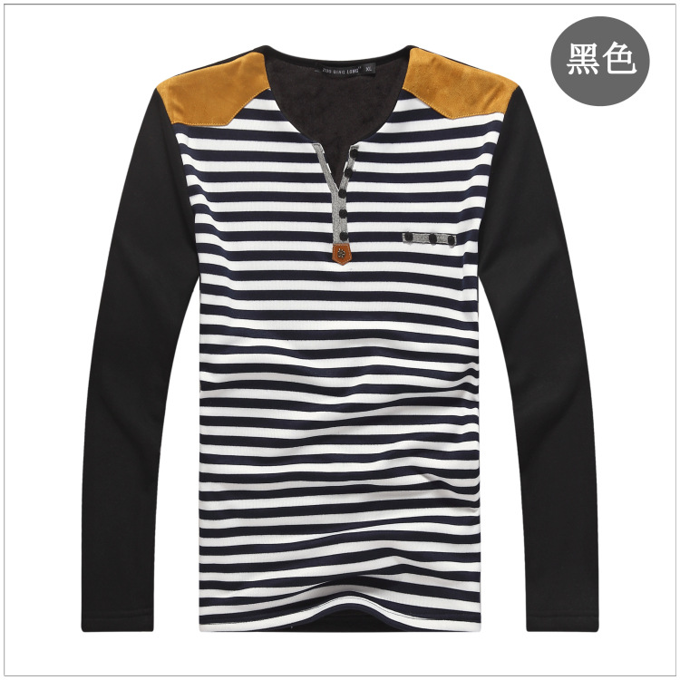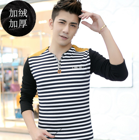 2014秋裝新款加絨加厚長袖打底衫 V領條紋修身韓版男裝t恤033