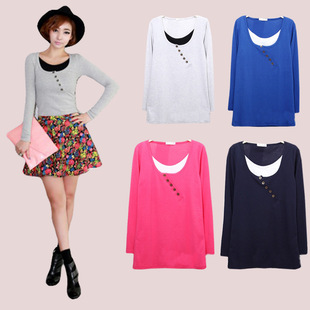 韓版新款磨毛圓領假兩件打底衫 五??坶L袖T恤 女裝新款 廠家直銷