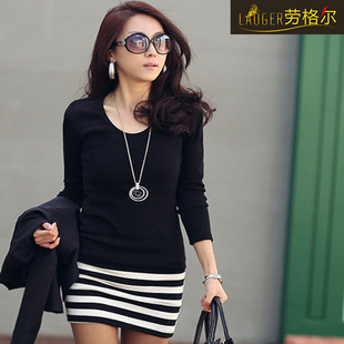 女裝新品 純棉磨毛修身長款V領打底衫 長袖T恤 長款T恤批發