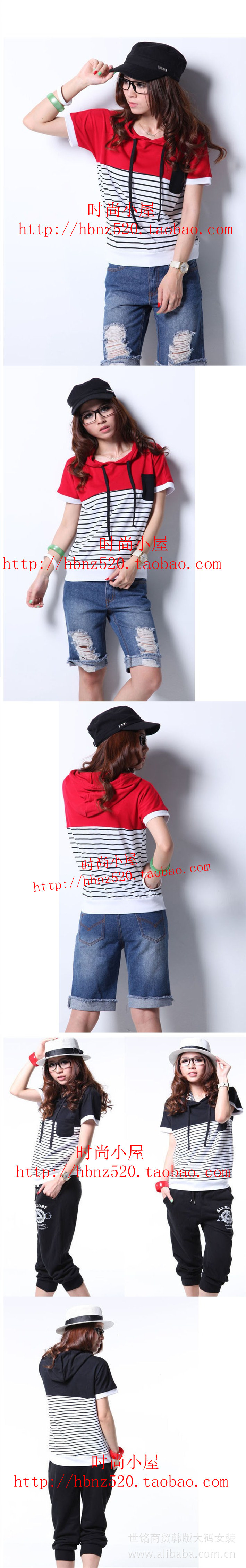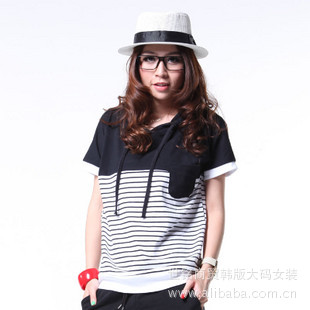 2012新款韓版帶帽條紋短袖t恤 夏裝時尚寬松大碼顯瘦女裝2012款