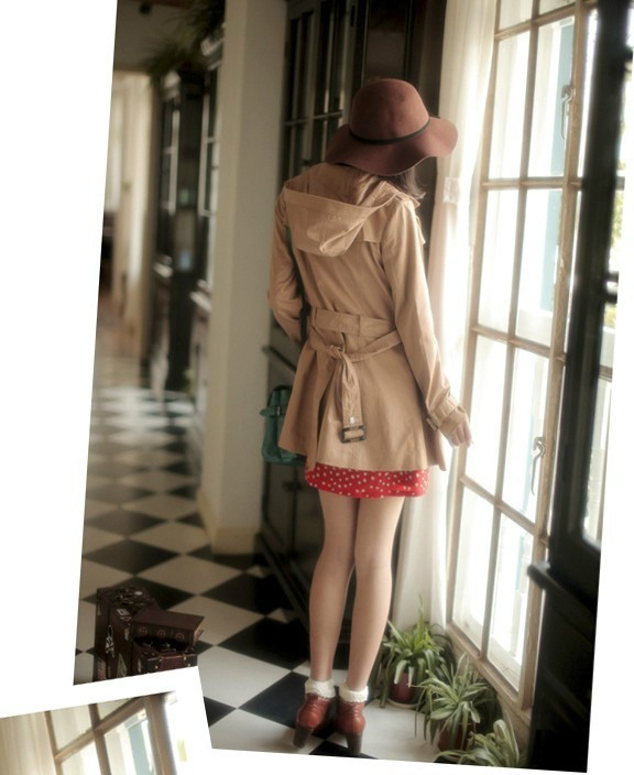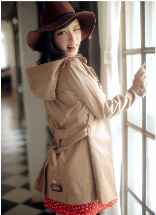 駝色來自于自然界的色彩卻具有一種非常都市化的味道,它是淡定的,就像一杯恰到好處的清茶,釅而不燥,淡而有味,是搭配中令人放心的底色——平和寧靜,但絕不乏味。連帽的修身式樣,適中的百搭長度,伴著袖口和腰間的帥氣腰帶式設計,束起腰封,立顯利落帥氣的休閑裝扮,盡顯高貴的優雅氣質。工藝上立體的剪裁,版型超贊,上身非常顯瘦哦!尤其是帽子的剪裁,時尚個性十足!面料上選用彈力斜紋質地,帶有柔弱光澤感的表層,伴著略微硬朗的質感更加挺立