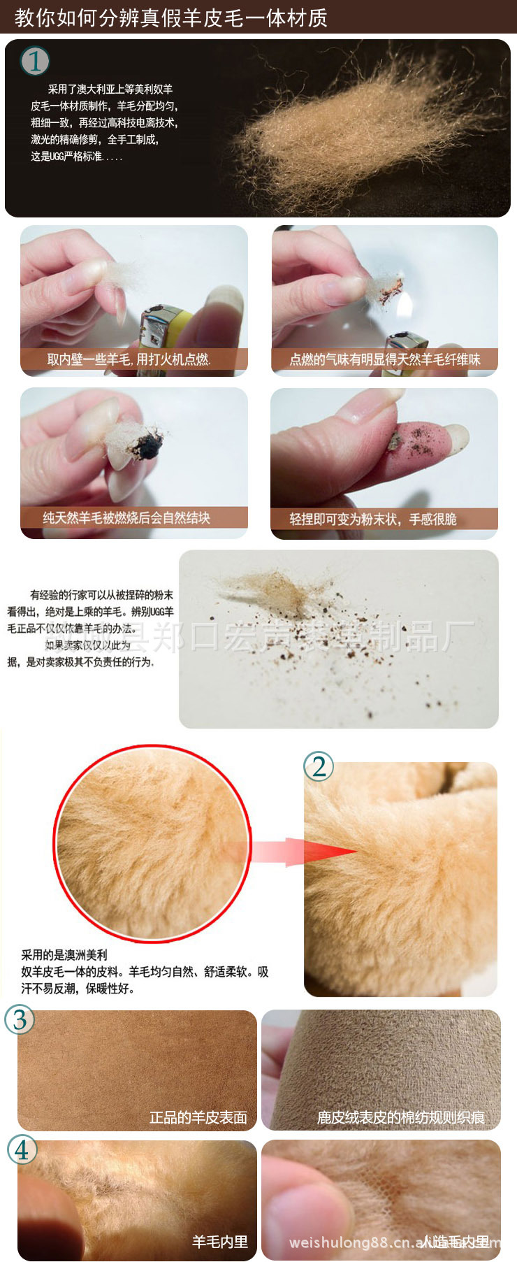 2、我司采用澳洲進口的羊皮毛一體的皮料,羊皮毛一體柔軟,容易起皺,大面有皺紋請各位親親放心這不是質量問題呦。這樣看上去既美觀又時尚、耐穿,又有很好的保暖透氣性能。