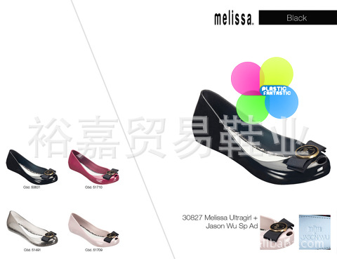 Melissa Ultragirl Jason Wu系列果凍鞋有平底芭蕾鞋和露趾高跟鞋兩款,每款分別有黑色、裸色、酒紅色、透明灰四種顏色。其中,平底芭蕾果凍鞋上還飾有超級萌的吳季剛 (Jason Wu) 貓頭鷹Logo蝴蝶結;而露趾高跟鞋頭的金屬鞋飾則是來源于吳季剛 (Jason Wu)2011秋冬女裝系列的元素;每一款鞋的內里細節,都還裝飾有性感的黑色蕾絲鑲邊,一款透明灰芭蕾鞋更是全部飾以蕾絲裝飾。