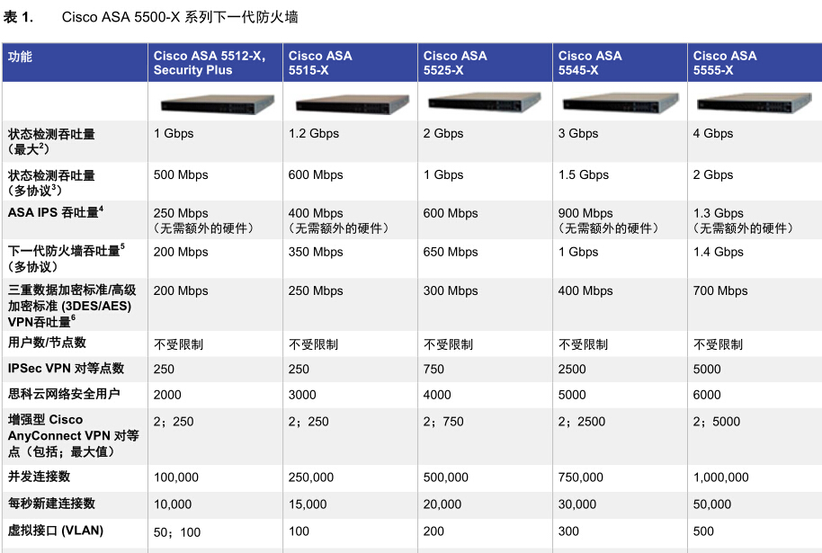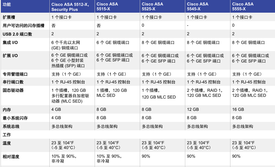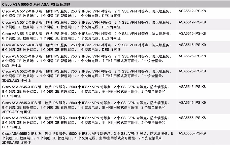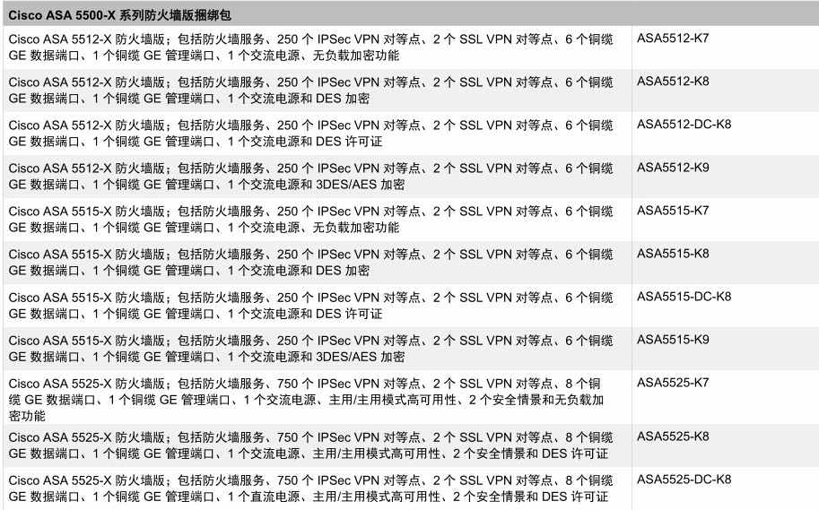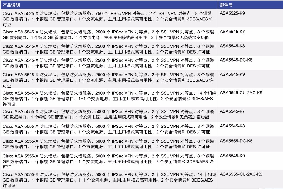 Cisco ASA 5525-X 防火墻版;包括防火墻服務、750 個 IPSec VPN 對等點、2 個 SSL VPN 對等點、8 個銅纜GE 數據端口、1 個銅纜 GE 管理端口、1 個交流電源、主用/主用模式高可用性、2 個安全情景和 3DES/AES 許可證 并發連接數500,000 狀態檢測吞吐量:2Gbps,多協議狀態檢測吞吐量:1Gbps,IPS吞吐量:600Mbps 8個GE接口