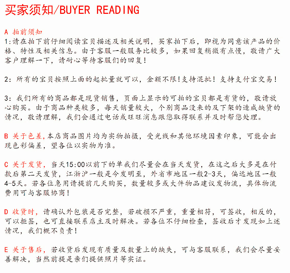 歡迎光臨,本店所展示的產品均有現貨,也可1件代發,保證質量,與本公司的合作產品也是廠家正品,本店默認的快遞是天天快遞,如果您要發其他快遞請與客服商量,如果只是指定其他快遞而沒有與客服相商,我們一律只發天天快遞,若不到您所在的區域請及時與客服聯系,若數量較多可走物流,具體費用可與客服協商,愿您購物愉快!