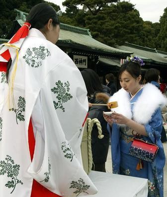 在日本,每年元月第二個周一為成人節,年滿20周歲的男生和女生要穿上隆重的服飾到神社進行參拜,然后喝上一杯清酒,代表正式成年(在日本未成年人是不可以喝酒的)。