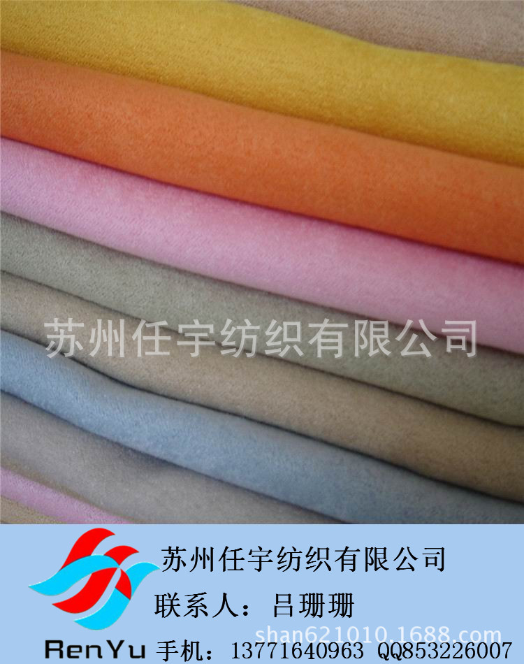 本公司專業生產麂皮絨系列的家紡與服裝面料,日產麂皮絨10萬米。麂皮絨,其特點為布面毛感細膩類似動物毛皮,面料本身輕薄透氣,經向麂皮絨(105D*150D、105D*200D、105D*300D、105D*400D、105D*600D)、緯向麂皮絨(75D*225D、75D*225*2、75D*160D、75D*180D)、針織麂皮絨、經編麂皮絨(50D*75D),成品門幅:110CM—280CM。成品克重:110G/M2---260G/M2。以上各種產品可再次添加各種后整理如:仿水、壓花、復合TPU膜及T/C底布、透氣透濕、吸濕排汗、刮膠、印花、燙金等。此類產品均為我司主打產品,一直以來廣受國內外新老客戶的認可。我們的宗旨是以過硬的品質及合理的價格來滿足每一個客戶的需求。您的滿意是我們的追求,我將永遠堅持此理念真誠的為每一位客戶服務。各位至高無上的客戶朋友們,我們期待與您早日合作。我司常年承接各類國內外訂單,并且已有自主進出口經營權,敬請廣大新老客戶來電咨詢洽談。