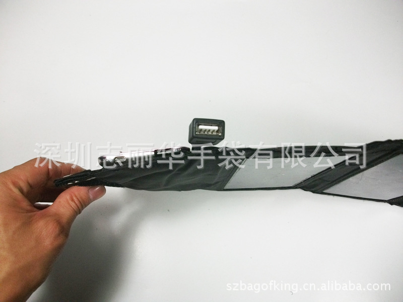 這是一款綠色能源,外表精美耐磨,可拆疊,攜帶方便??蓲煸诖皯?,背包,帳篷或樹枝等物體上,對著陽光即可給用電器充電,電路部件采用合金材質制成具有防銹耐折效果,是戶外活動必備的理想用品。它帶有多款接頭,適合不同的用電器。也可根據客人要求,定制轉接頭。