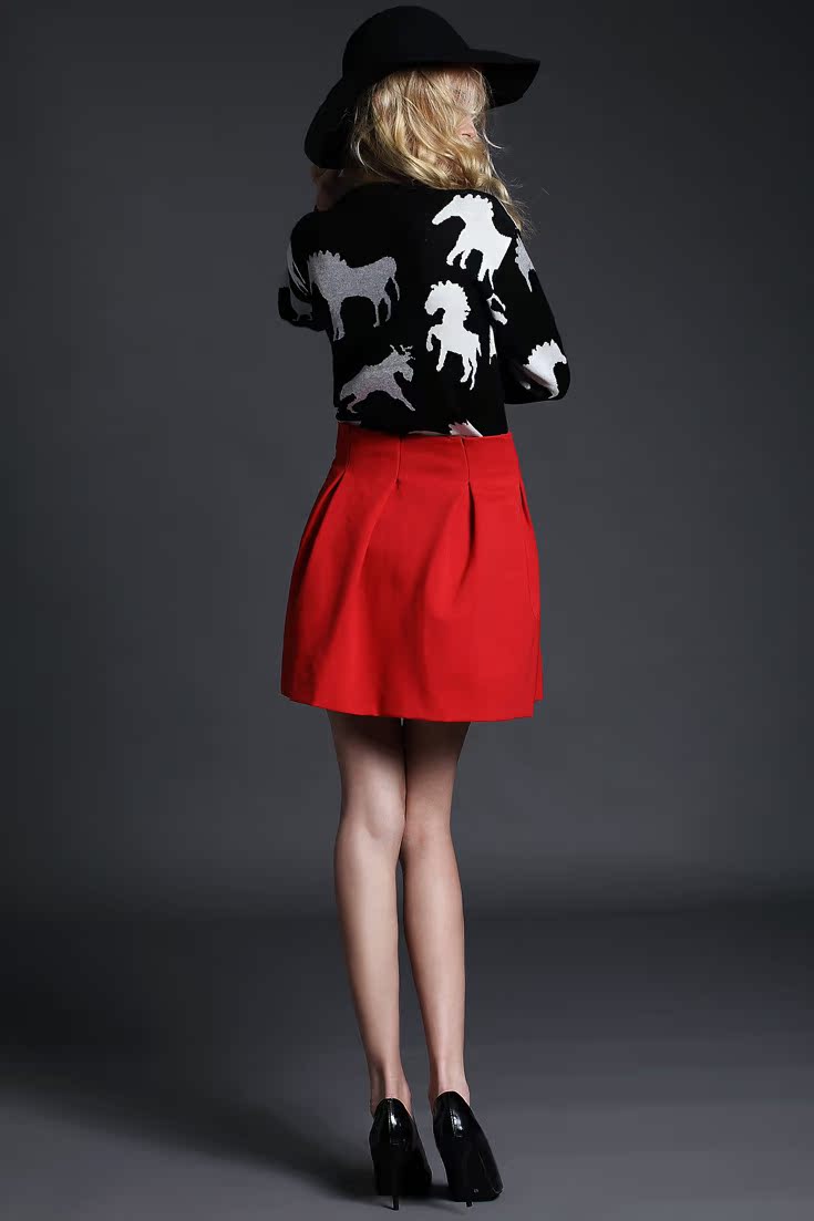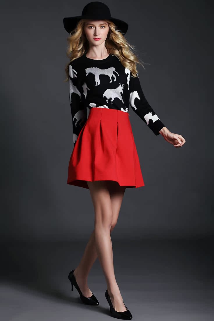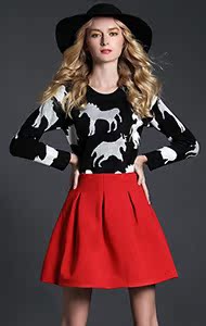 歐洲站2014秋冬新款女裝 歐美印馬針織上衣蓬蓬裙兩件套套裝ZR469