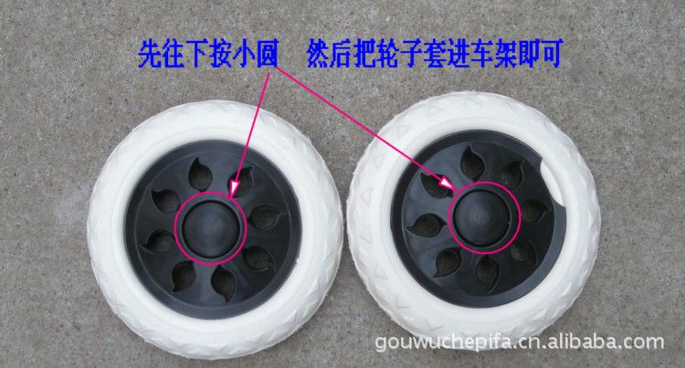 輪子的安裝與拆下還是非常簡單;只要按下(用力按到位)輪子中心的小活動圓圈; 然后把輪子往車架上套到或者取出即是完成安裝與拆卸;