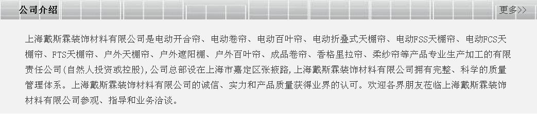 上海戴斯霖裝飾材料有限公司是一家開發銷售電動窗飾·智能遮陽產品的專業公司。主要產品有:電動開合簾、電動卷簾、電動百葉簾、電動折疊式天棚簾、電動FSS天棚簾、電動FCS天棚簾、FTS天棚簾、戶外天棚簾、戶外遮陽棚、戶外百葉簾、成品卷簾、香格里拉簾、柔紗簾等產品,專業生產加工的有限責任公司(自然人投資或控股),公司總部設在上海市嘉定區,公司擁有完整、科學的質量管理體系。公司的誠信、實力和產品質量獲得業界的認可。歡迎各界朋友蒞臨參觀、指導和業務洽談。