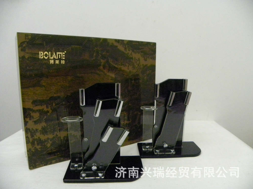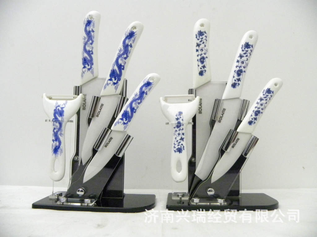 規格:菜刀6寸,廚師刀6寸、水果刀4寸、青龍印花瓷削皮器;亞克力刀架;精品禮盒包裝。
