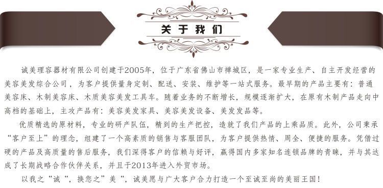我司長期與大型連鎖美容院、休閑會所等合作,積累了豐富的經驗,生產的木制美容床、工具車等木制產品,以其優質、耐用、簡約高檔的特性,受到眾多美容院的一致認可與贊揚。同時在原有木床等樣品基礎上,根據客戶的要求進行合理修改,為客戶量身定做,為客戶打造的樣式。