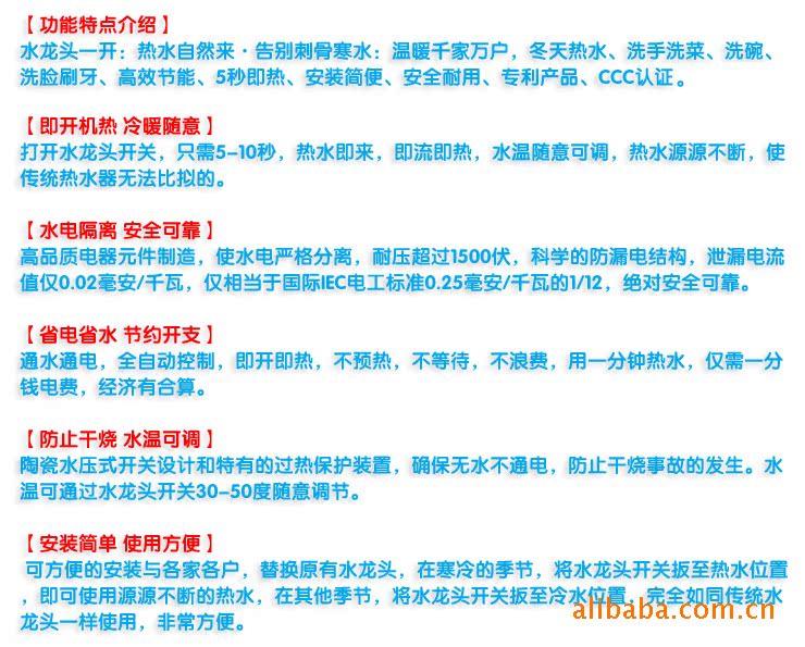 五、鑫暖天電熱水龍頭優點是:省水,省電,省空間,使用方便,高效,一年365天不管什么時候想用熱水就有熱水,溫度30-60度可無極調溫(與水量成反比),冷熱水雙用,一個水龍頭當二個用,無需預熱,無需保溫,即開即熱。