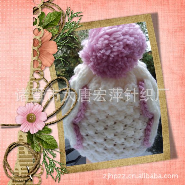 整頂帽子都是用手工制作 白色為主色加上淺紫色的同樣手工制作的蝴蝶結和大毛毛球設計 使得整個帽子生動有趣 清純又不失可愛