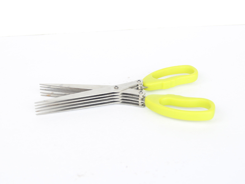 產品名稱五層剪刀型號SM1008材料2CR13 PP尺寸全長:19*7*2cm;剪肉:12cm重量117g厚度1.5mm顏色黃色、藍色、綠色等多種顏色選擇包裝PP膠袋用途可用于剪蔥、手工剪紙、機密碎紙、剪海帶等等