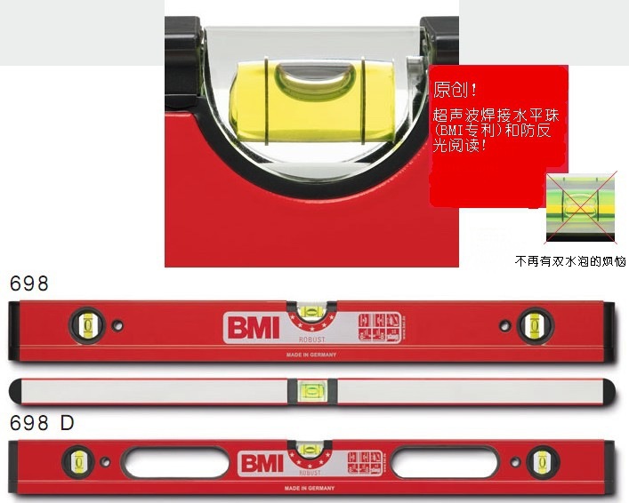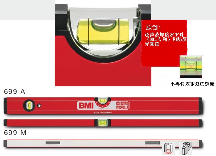 • BMI原創管式半球形水平面水平珠,帶放大功能,應用于倒向位置測量,而且可以提供卓越的閱讀效果