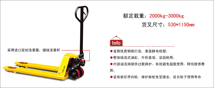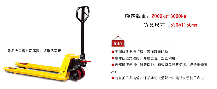 產品詳細參數貨 號額定載重貨叉高度貨叉高度單個貨叉寬度貨叉整體寬度貨叉長度前輪規格后輪規格凈重單位kgmmmmmmmmmmmmmmkg10v00393200085205160530115080*60200*507510v00394200085205160685122080*60200*507810v00395250085205160540115080*70200*507710v00396250085205160680122080*70200*508010v00397300085205160540115080*70200*508510v00398300085205160680122080*70200*5088快速訂購、支持專線:400-8866-890