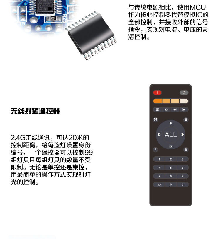 單獨/集中控制: 完美實現單控/組控/集控等多種控制功能,可單獨控制某一盞燈具,集中控全部燈具,1個遙控器同時控制無數盞燈。操作簡易:同時兼容多種控制方式,墻體普通開關調節、無線遙控調節、觸摸面板二次節能控制。距離可達20米以上。